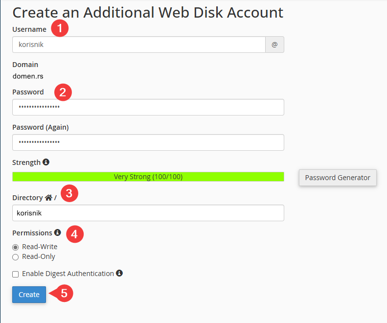 Pored glavnog cPanel korisnika, koji ima pristup svim fajlovima i folderima u hosting nalogu, možete kreirati dodatne Web Disk korisnike koji će imati ograničen pristup određenim folderima, što je svakako i preporuka.
