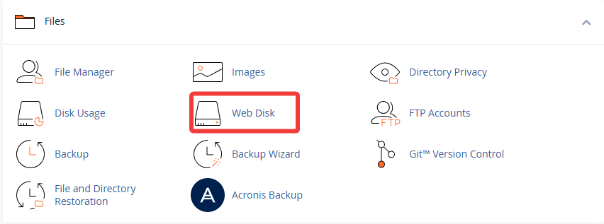 U kategoriji "Files" u cPanelu, odaberite "Web Disk":