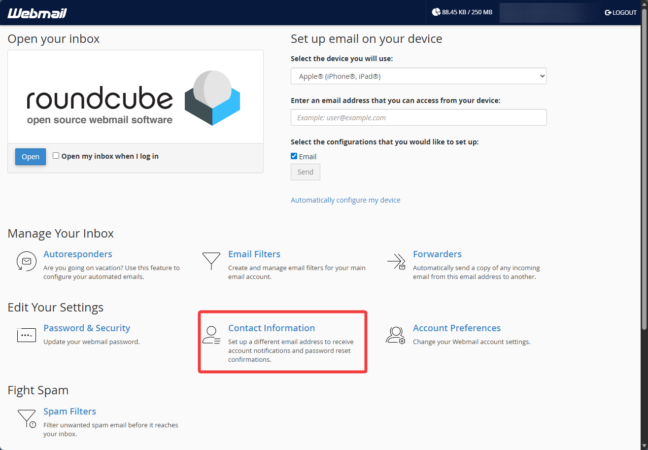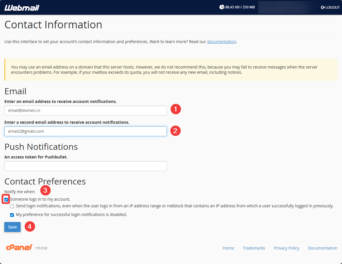 Radi bolje bezbednosti Vašeg email naloga, preporuka je da omogućite automatska obaveštenja o uspešnim pristupima Webmail nalogu, kako biste bili obavešteni ukoliko dođe do krađe Vaše lozinke i neovlašćenog pristupa Vašem email nalogu. To možete podesiti putem "Contact Information" opcije u okviru Webmail podešavanja.